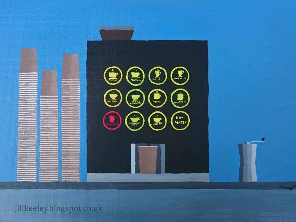 Gumball Machine (1970, linocut). Thiebaud described this as a reward system, you put something in and you get an instant reward. With the office coffee machine we simply select from a baffling array of options, press a button and out it comes. We don't even have to wash up afterwards, preferring instead to fill up landfill sites with our disposable single use cups. Of course there's always one (you know who you are) who thinks this is all far too easy and insists of grinding his own coffee beans every morning for an altogether more satisfying coffee experience. It would have been rude not to acknowledge his efforts here. I worked from memory again on this one and I noticed that this approach was starting to make me pay more attention to the things around me. I'd never really thought about the different shaped cups on the pictures on the machine before. Or about how pointless that is when you have to put a standard sized cup on the tray so the machine can squirt the correct amount of liquid in without it overflowing. By the time I had finished I never wanted to see another paper coffee cup for the rest of my life but it was worth putting the time in to get it right.